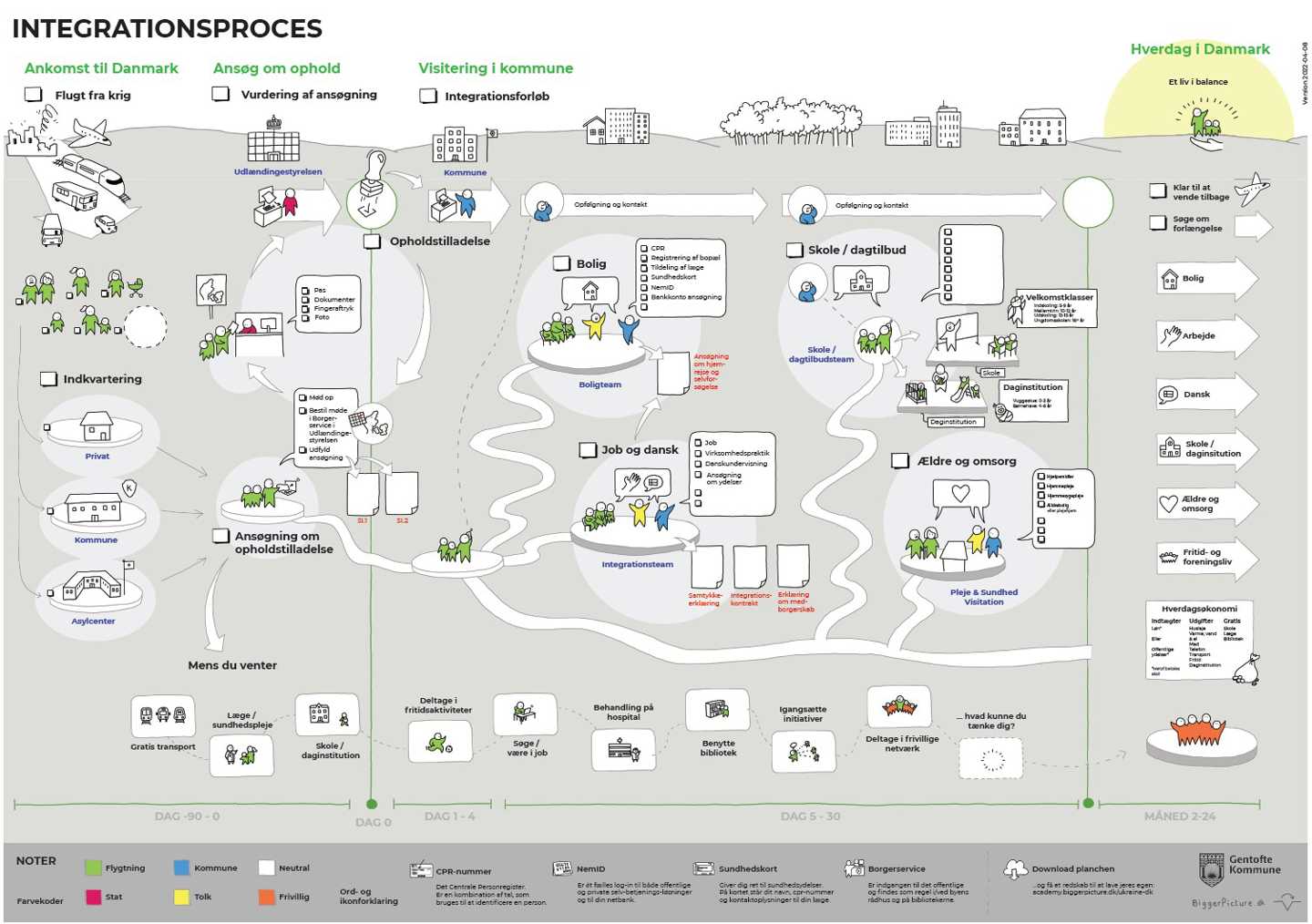 Tegningen nedenfor viser den samlede proces for indrejse og ophold i Danmark. Klik på tegningen for at se stort format.
